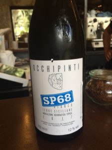 SP 68 Bianco 2017, di Arianna Occhipinti, vino da uve autoctone (Albanello e Moscato di Alessandria) con macerazione sulle bucce di ben 15 giorni, prodotto con metodi artigianali senza utilizzo di lieviti selezionati. Porta il nome del percorso che Arianna compie quotidianamente per recarsi nelle vigne: SP 68 è il nome della strada!